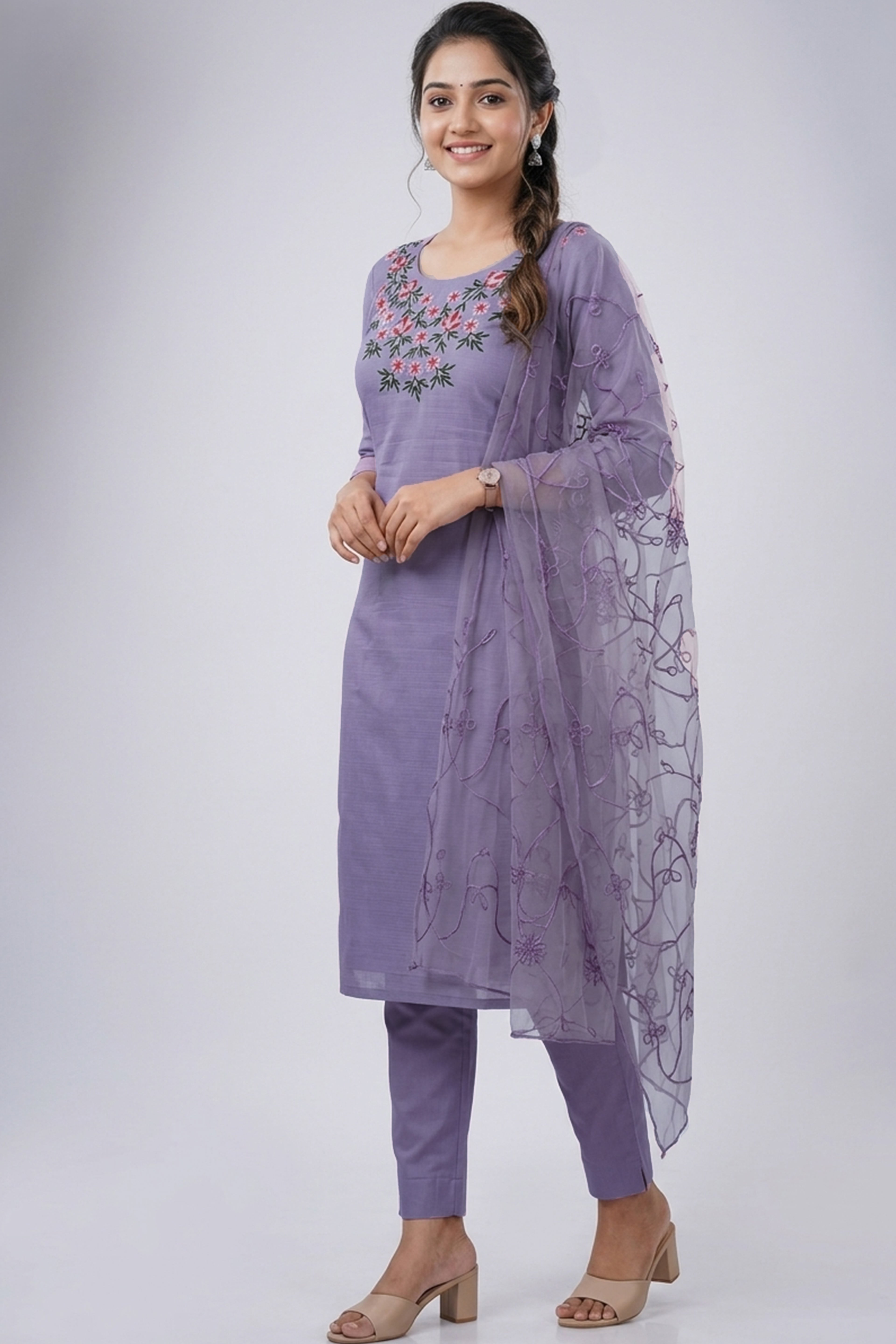 Rich silk churidar set featuring delicate floral thread detailing, ideal for festive and traditional occasions.