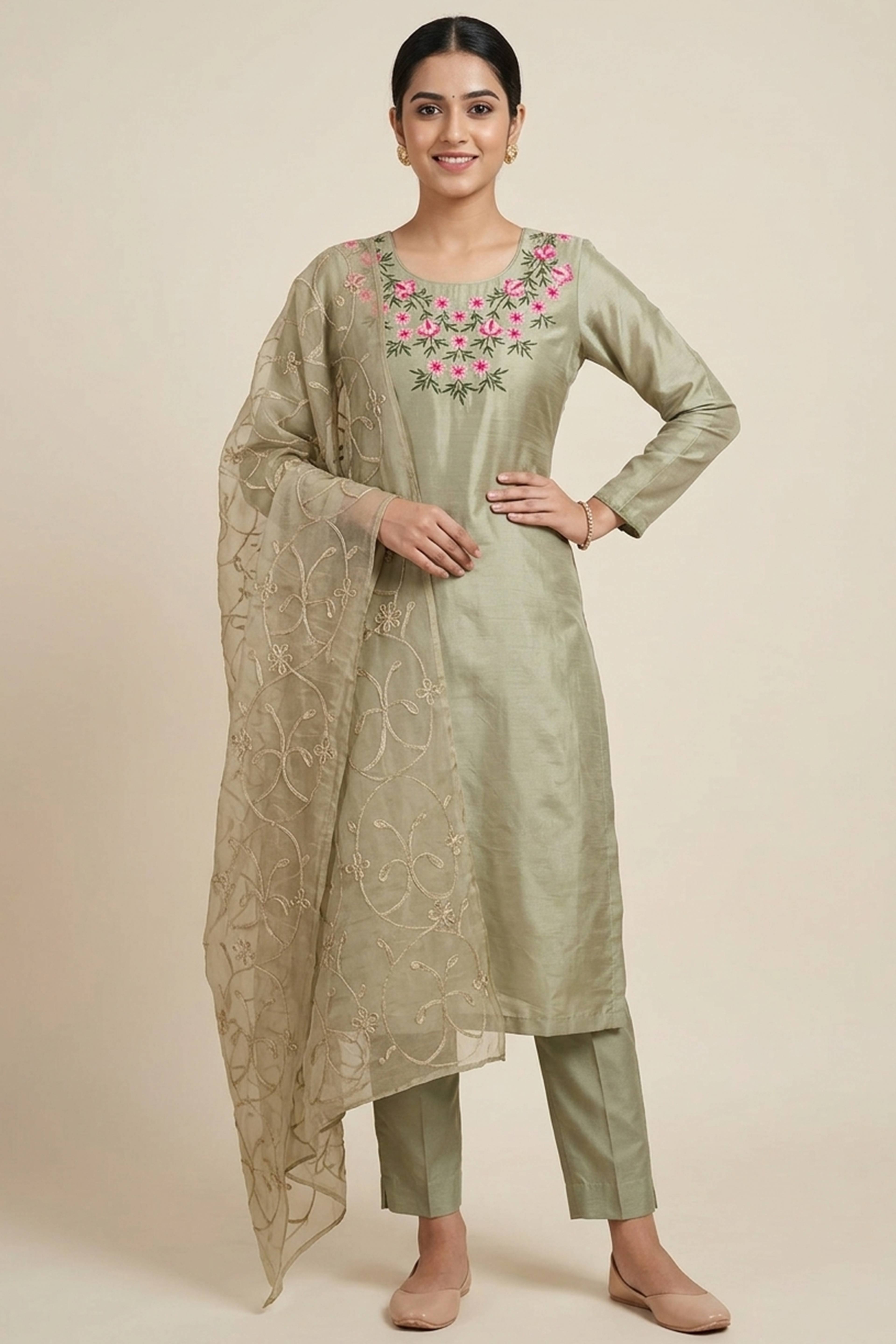 Rich silk churidar set featuring delicate floral thread detailing, ideal for festive and traditional occasions.
