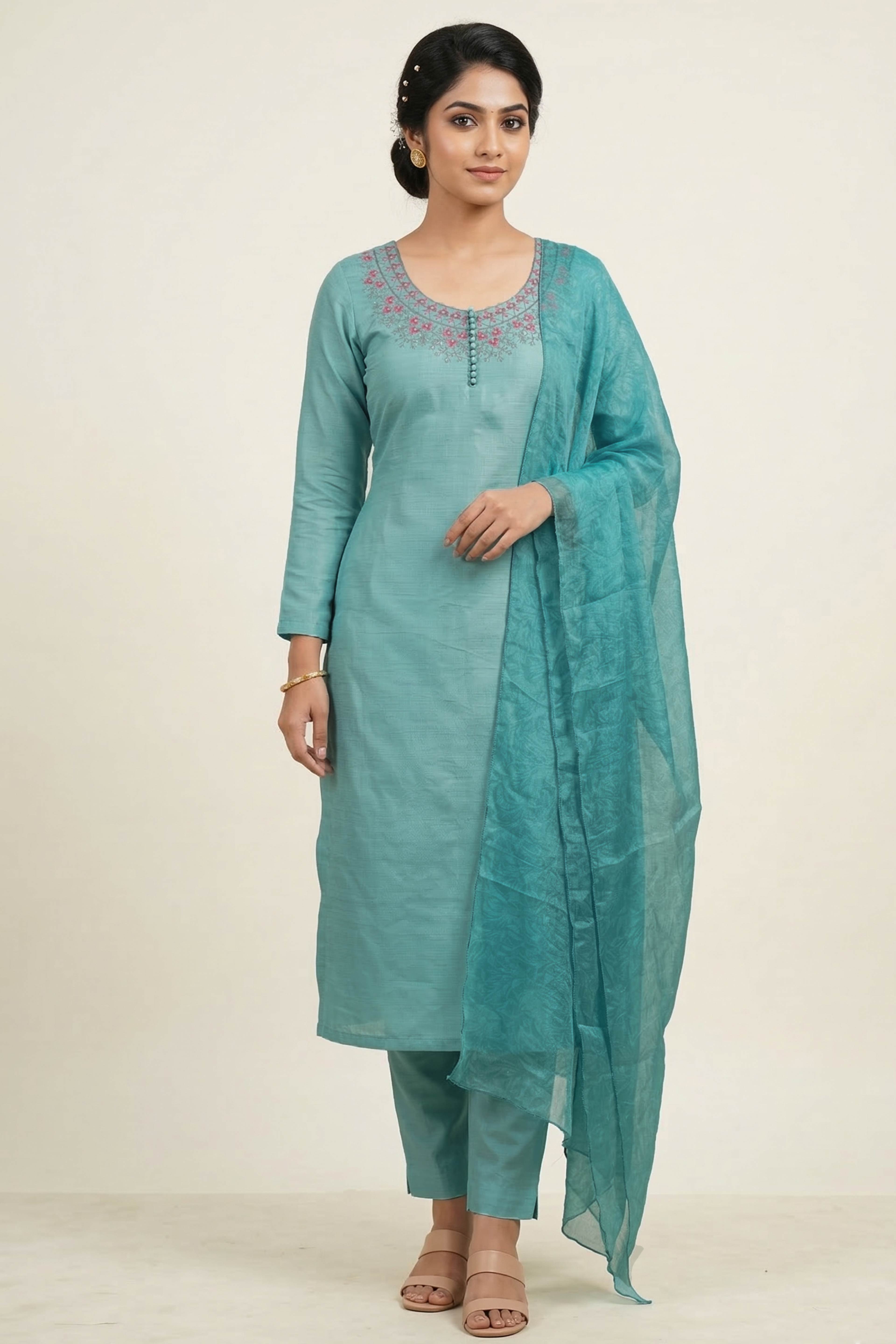 Elegant silk churidar material featuring delicate floral thread embroidery enhanced with shimmering sequins, creating a graceful festive look.