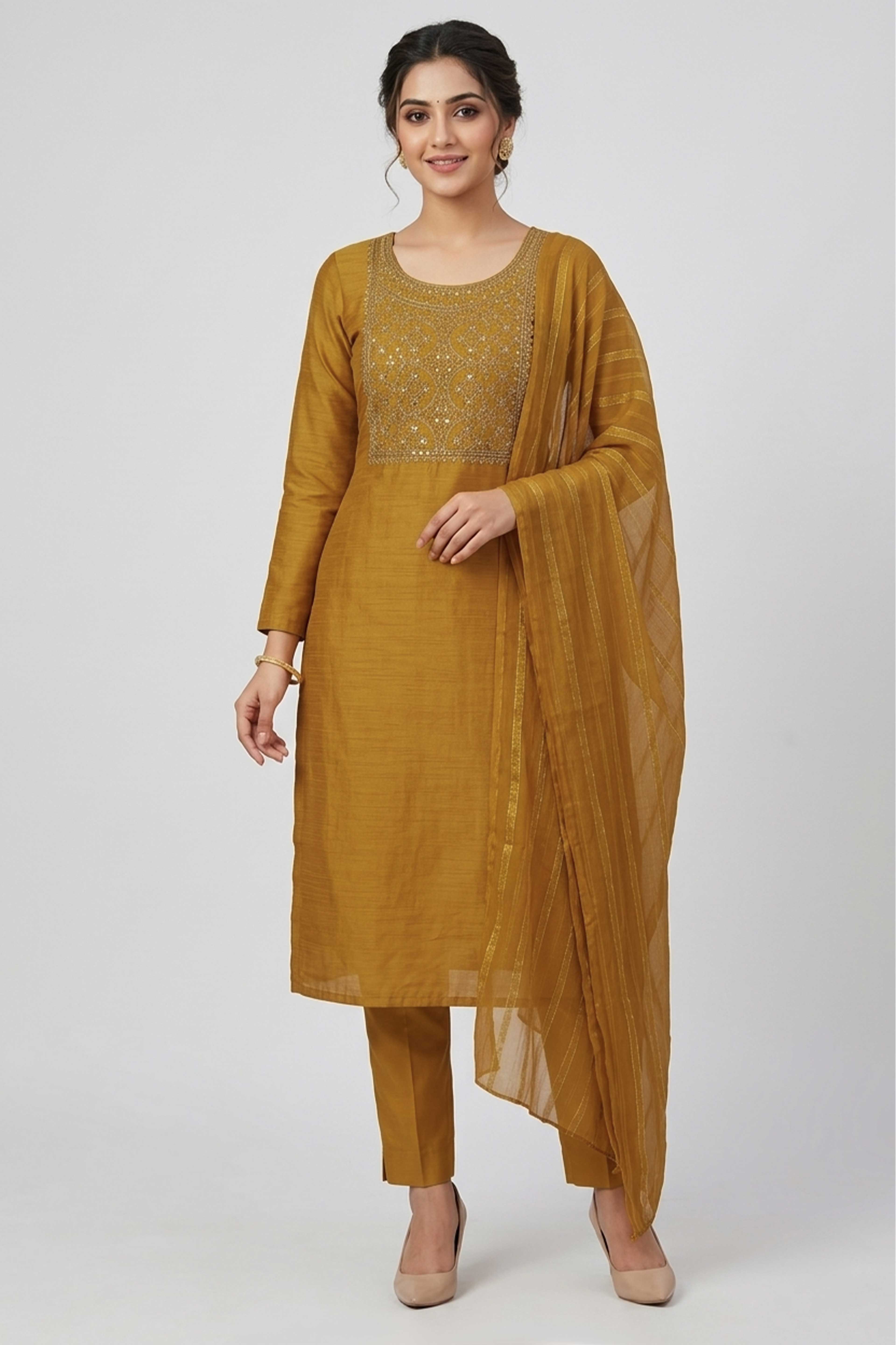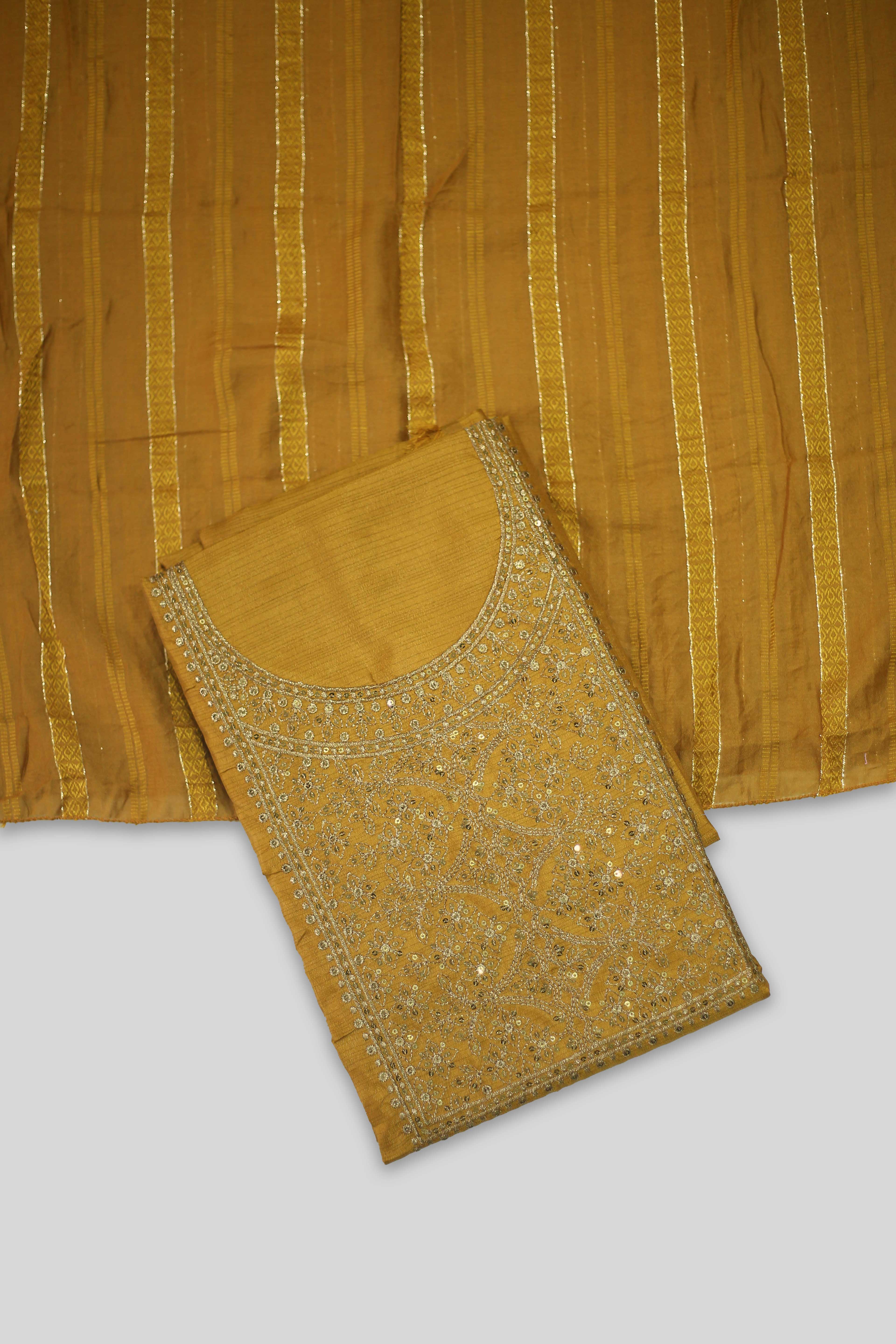 Elegant silk churidar material featuring rich golden thread embroidery enhanced with subtle sequins, perfect for festive and special occasions.