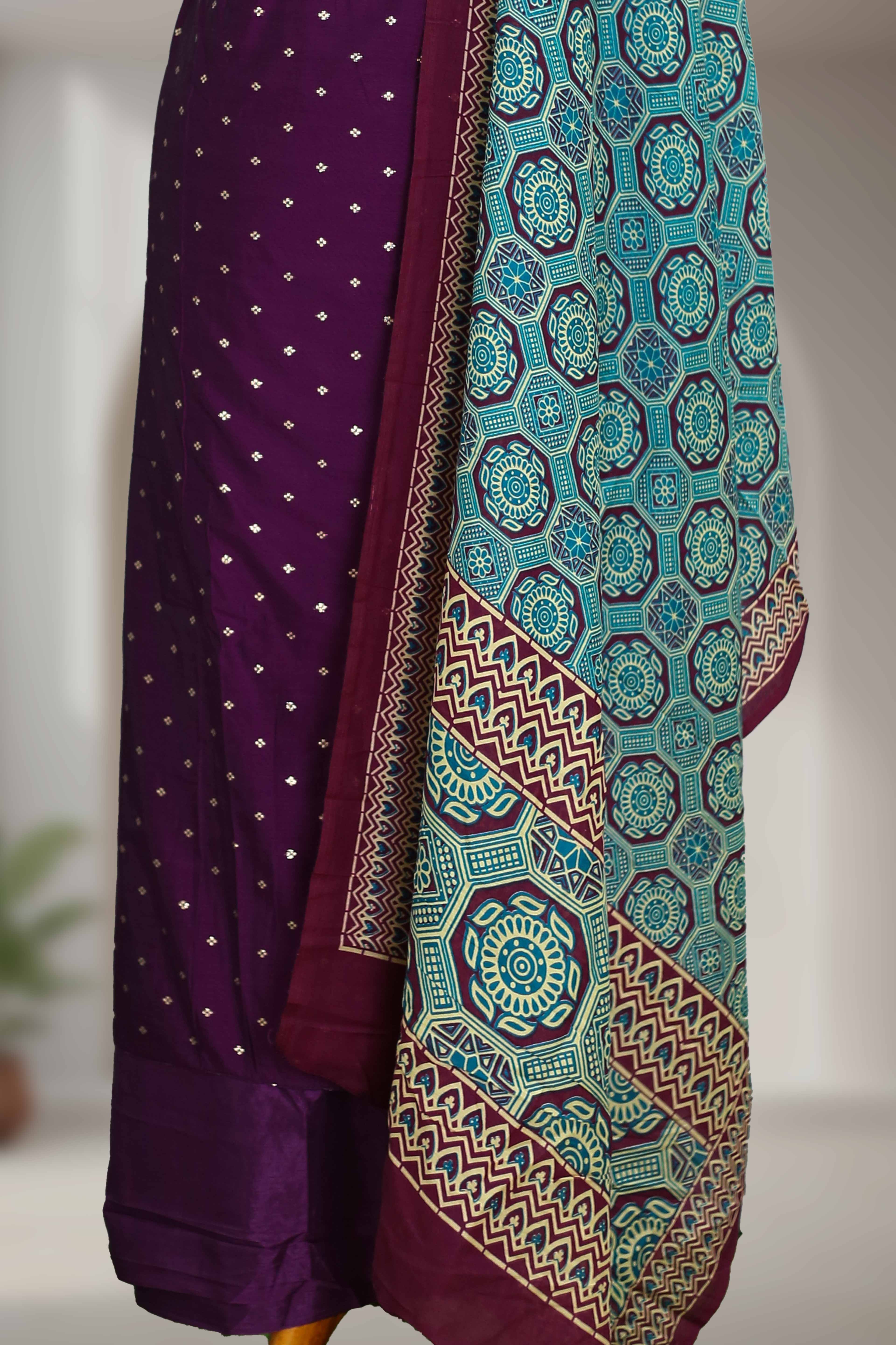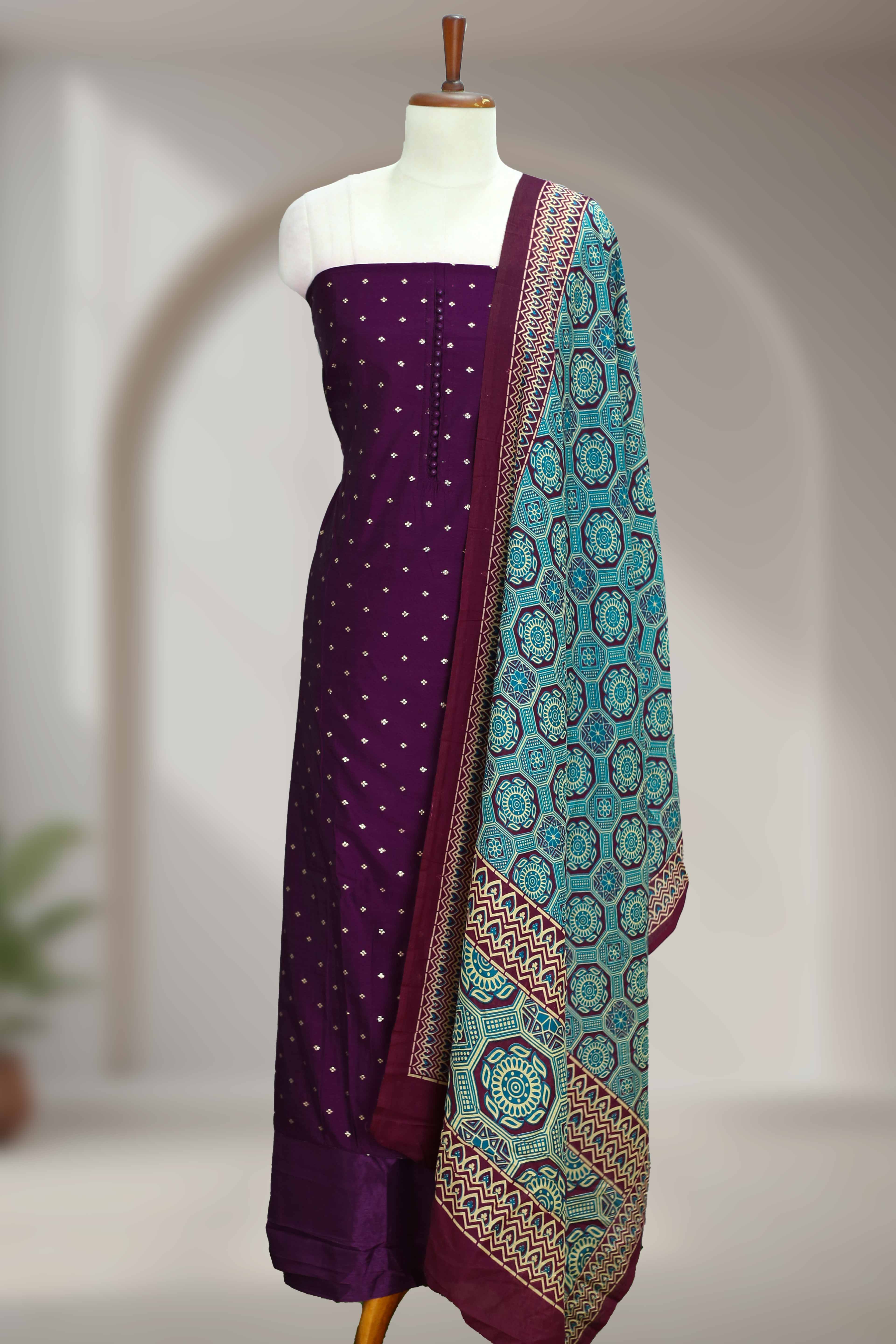 Crafted in premium silk, this churidar material set features elegant button work combined with traditional butta design. Styled with a classic box neck, it comes with a 2.5 m top, 2 m bottom, and 2.2 m dupatta, offering the perfect fabric length for custom tailoring into a graceful ethnic outfit.