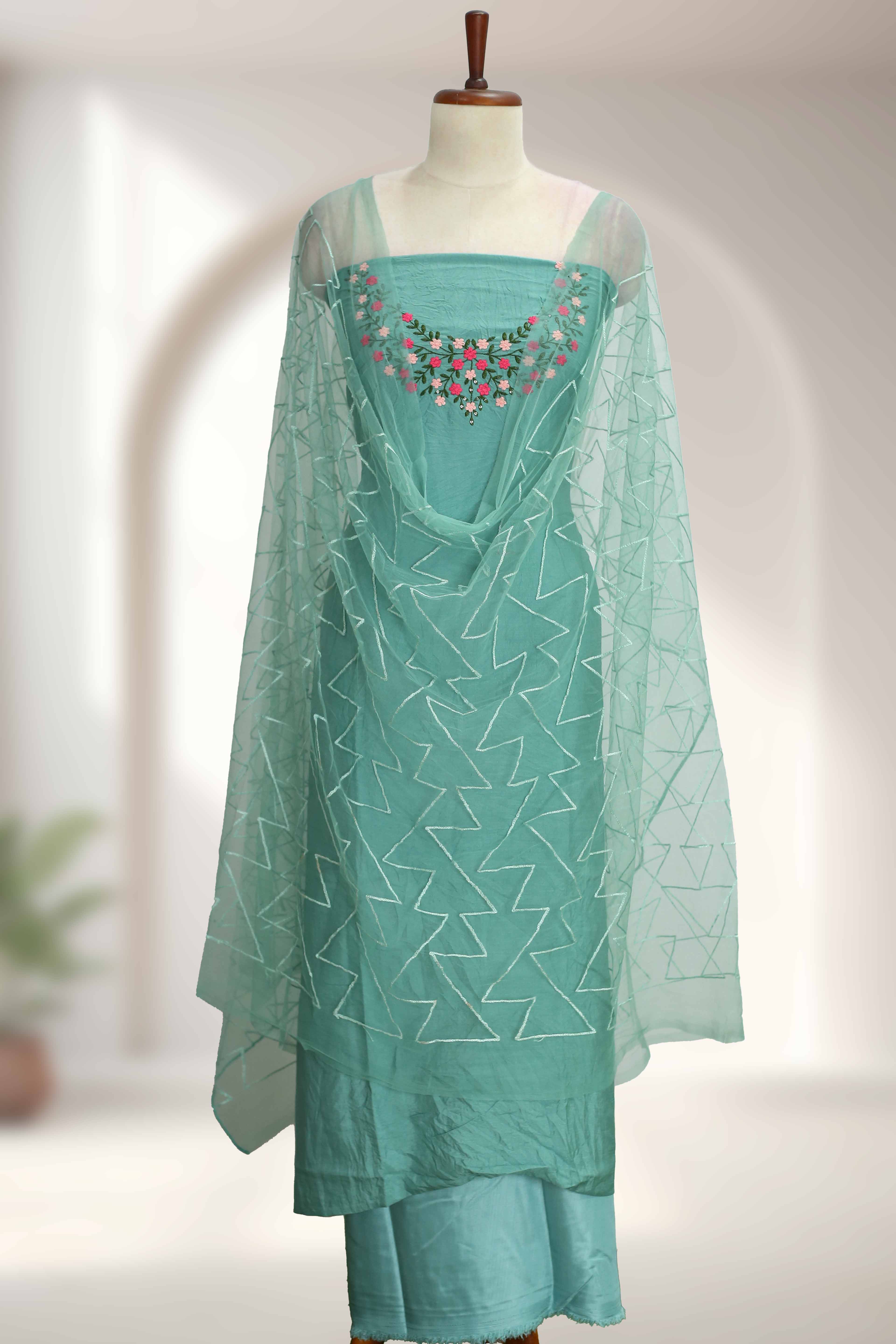 Add a touch of grace to your ethnic wardrobe with this beautiful Silk Churidar Material set. Featuring elegant floral print on luxurious silk fabric, this set is ideal for festive wear or traditional occasions. The round neck design adds a sophisticated edge to your stitched outfit.