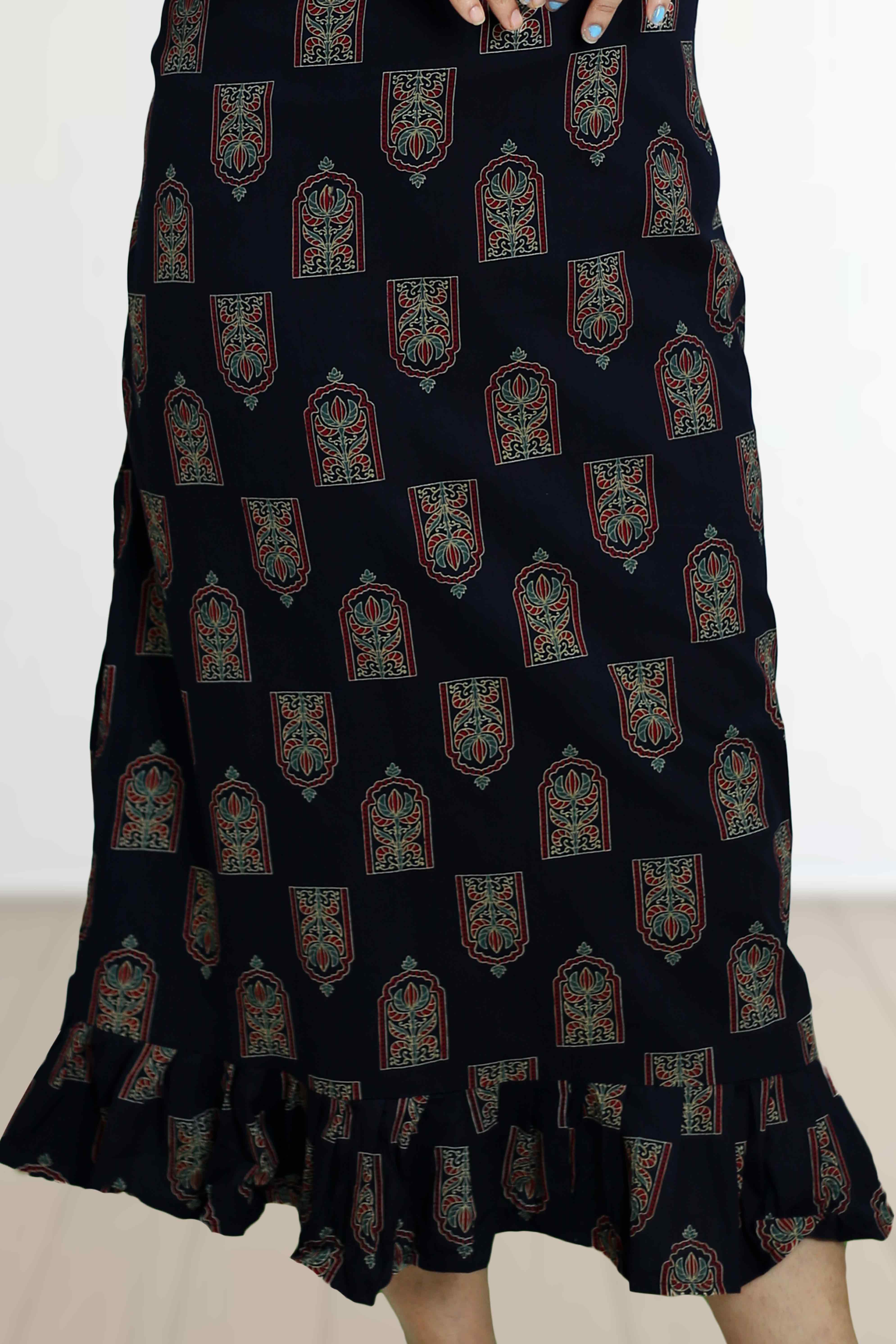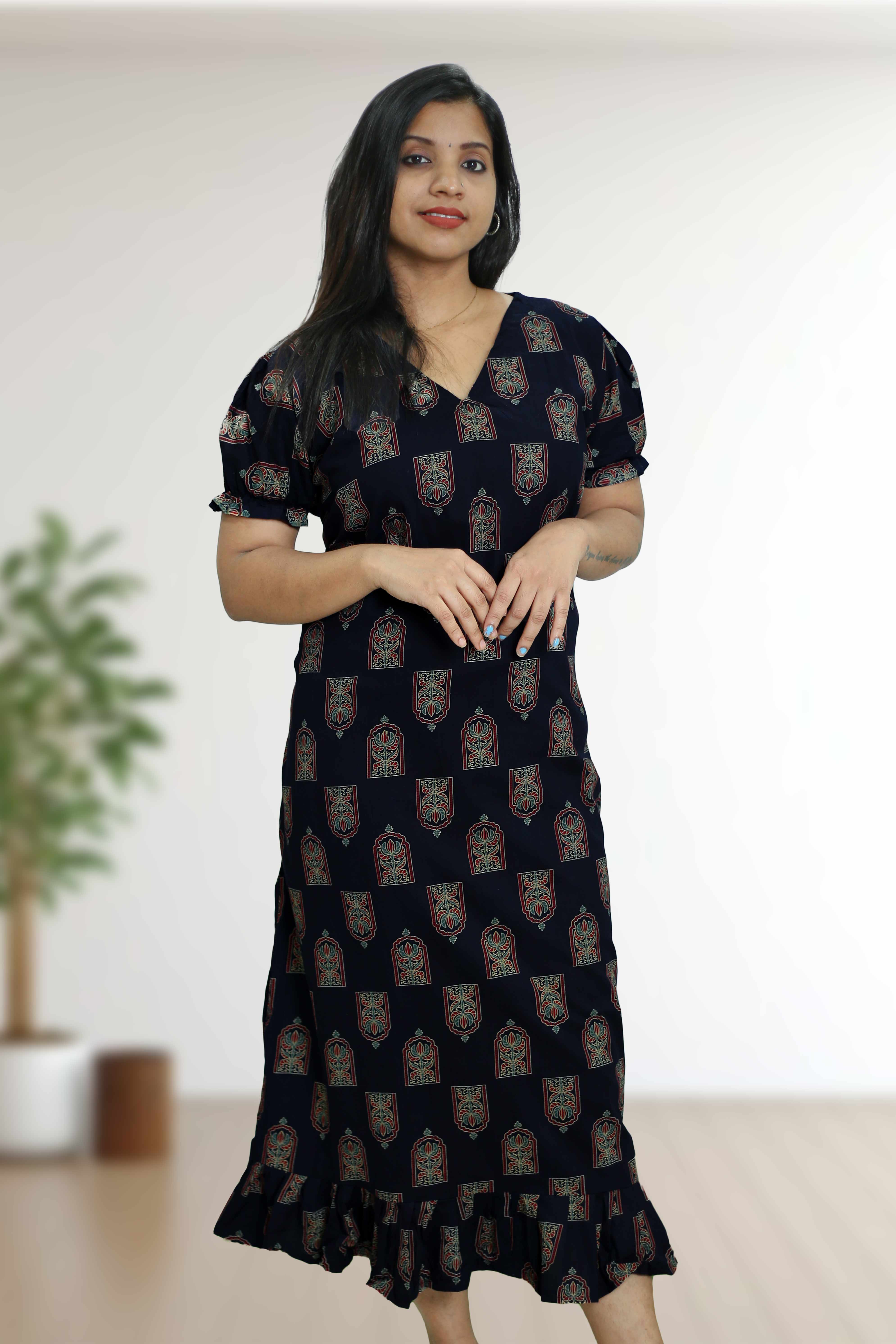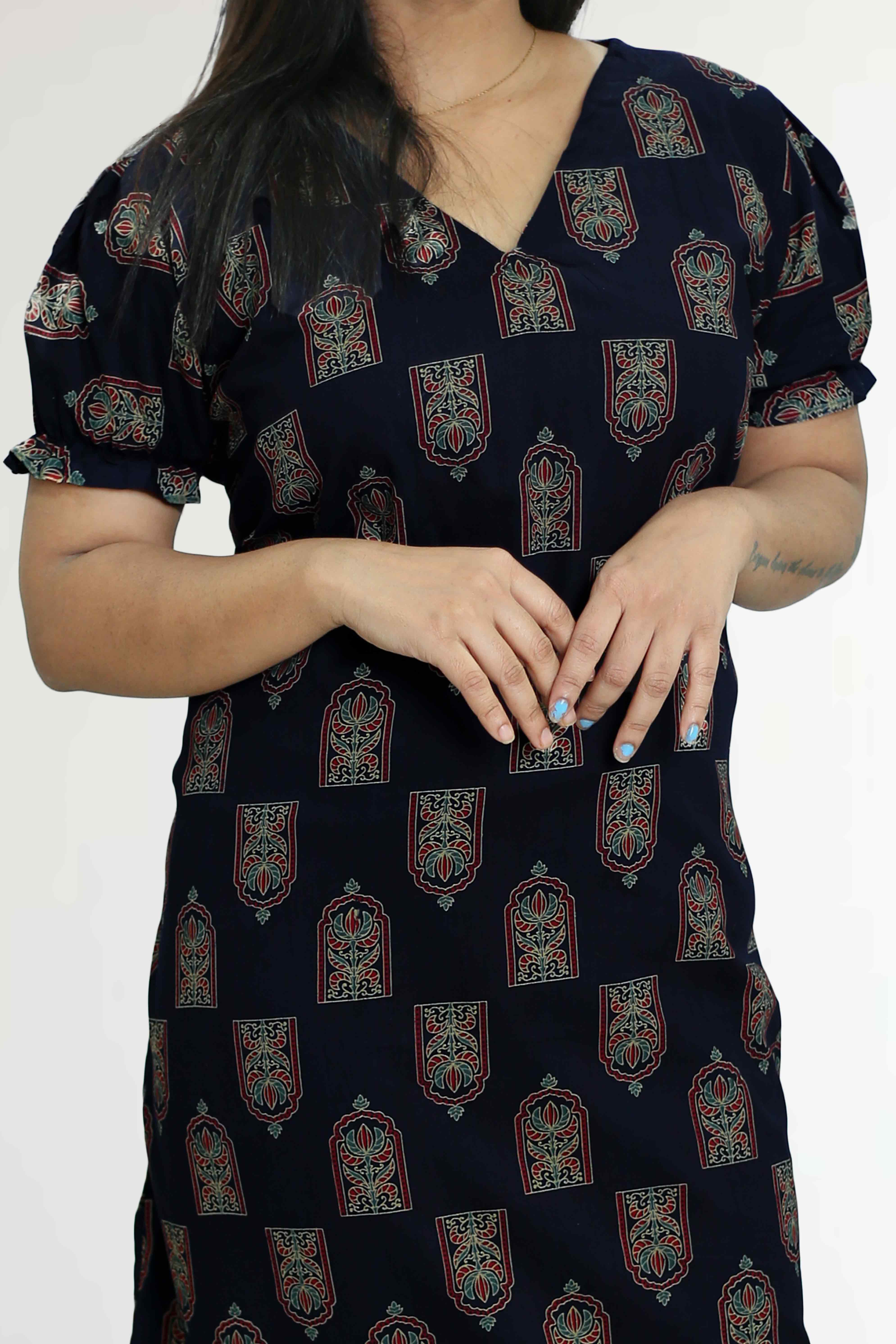 Ajarak Print Cotton Night Dress – V Neck & Puff Sleeve: