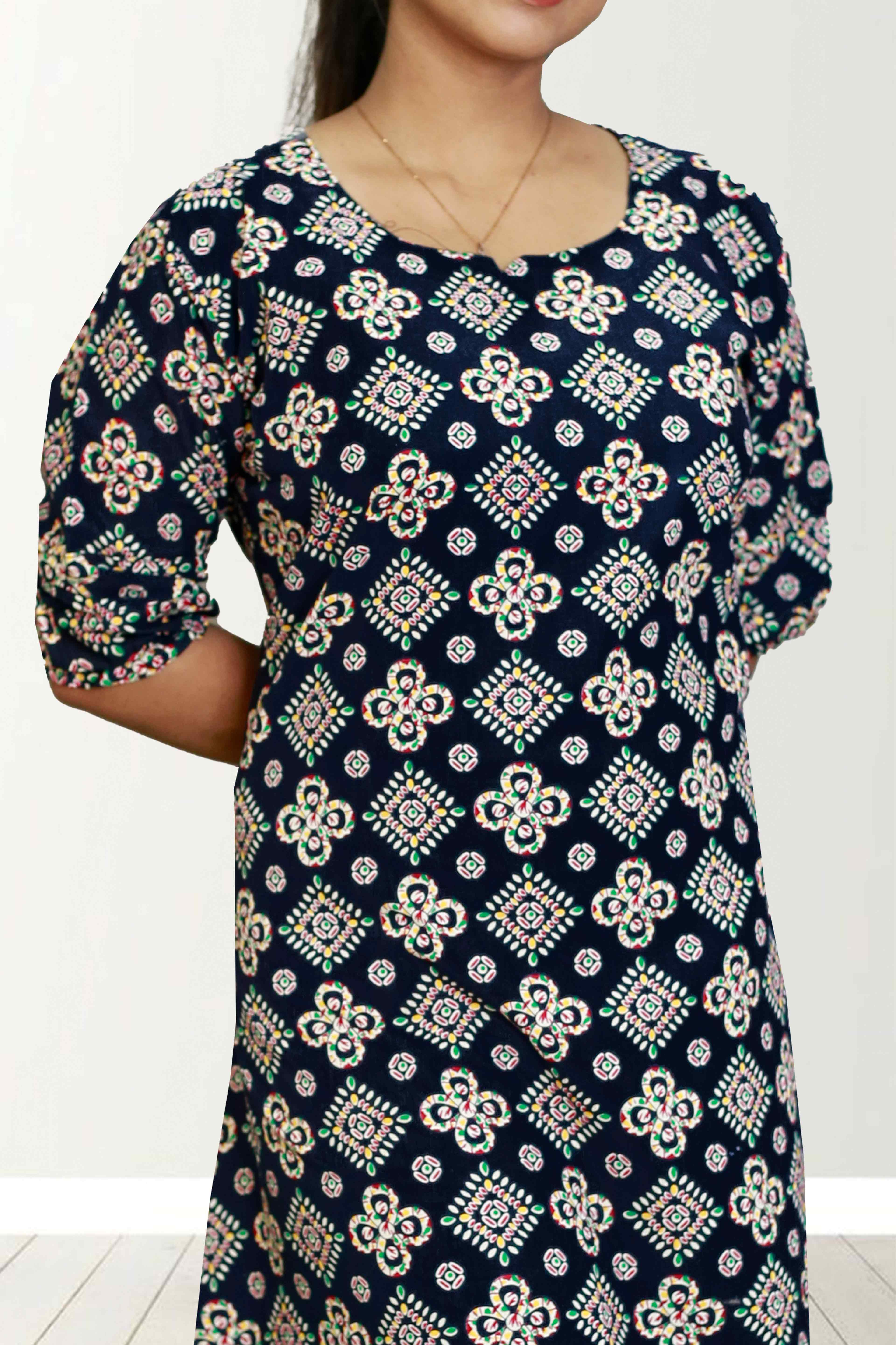 Sleep in style with our cozy Cotton Frock Night Dress. Designed with a graceful slit neckline and charming floral prints, this piece features stylish puff sleeves for that touch of elegance β€” perfect for breezy comfort all night long.