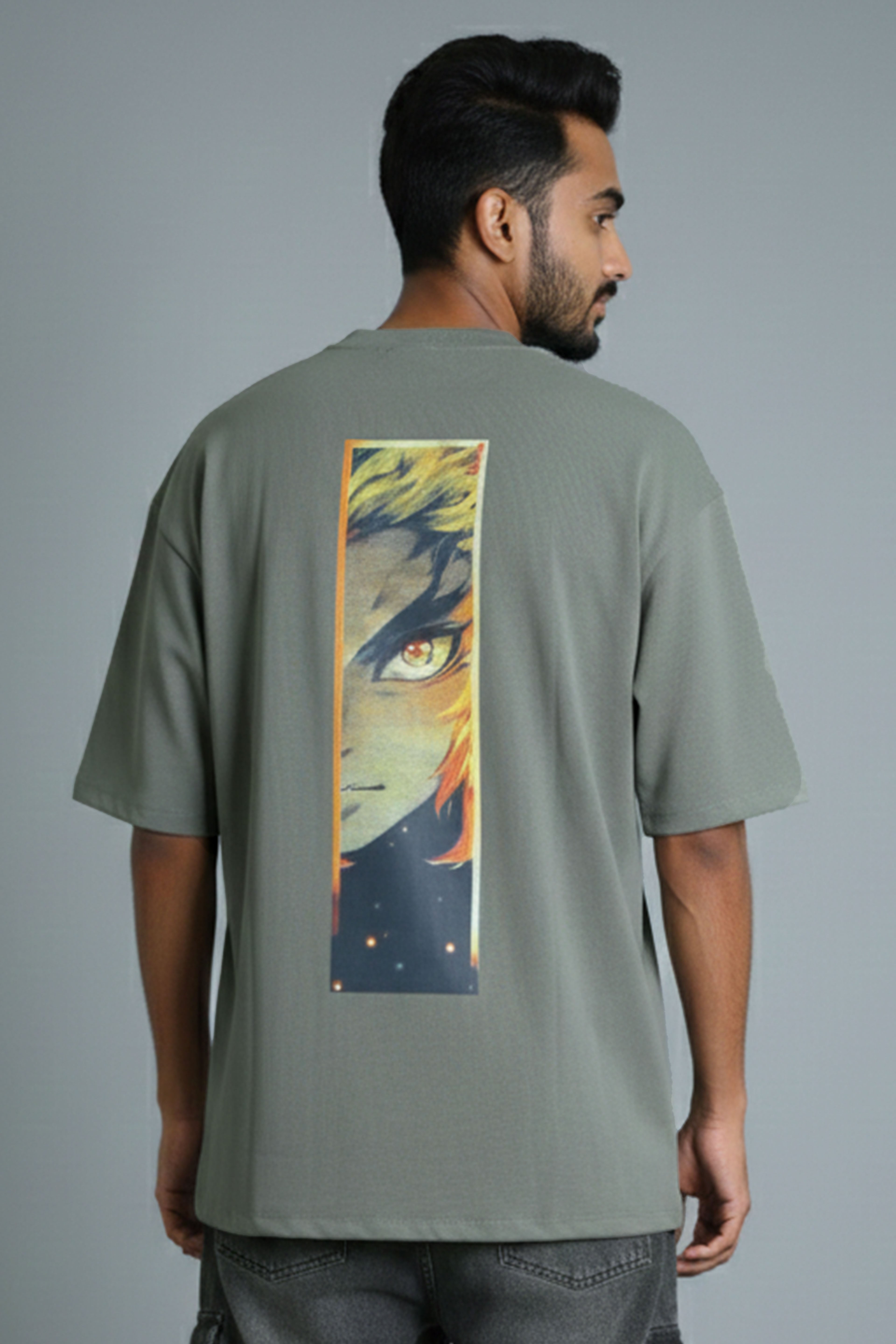Stylish drop shoulder T-shirt featuring an exclusive print inspired by Kyojuro Rengoku