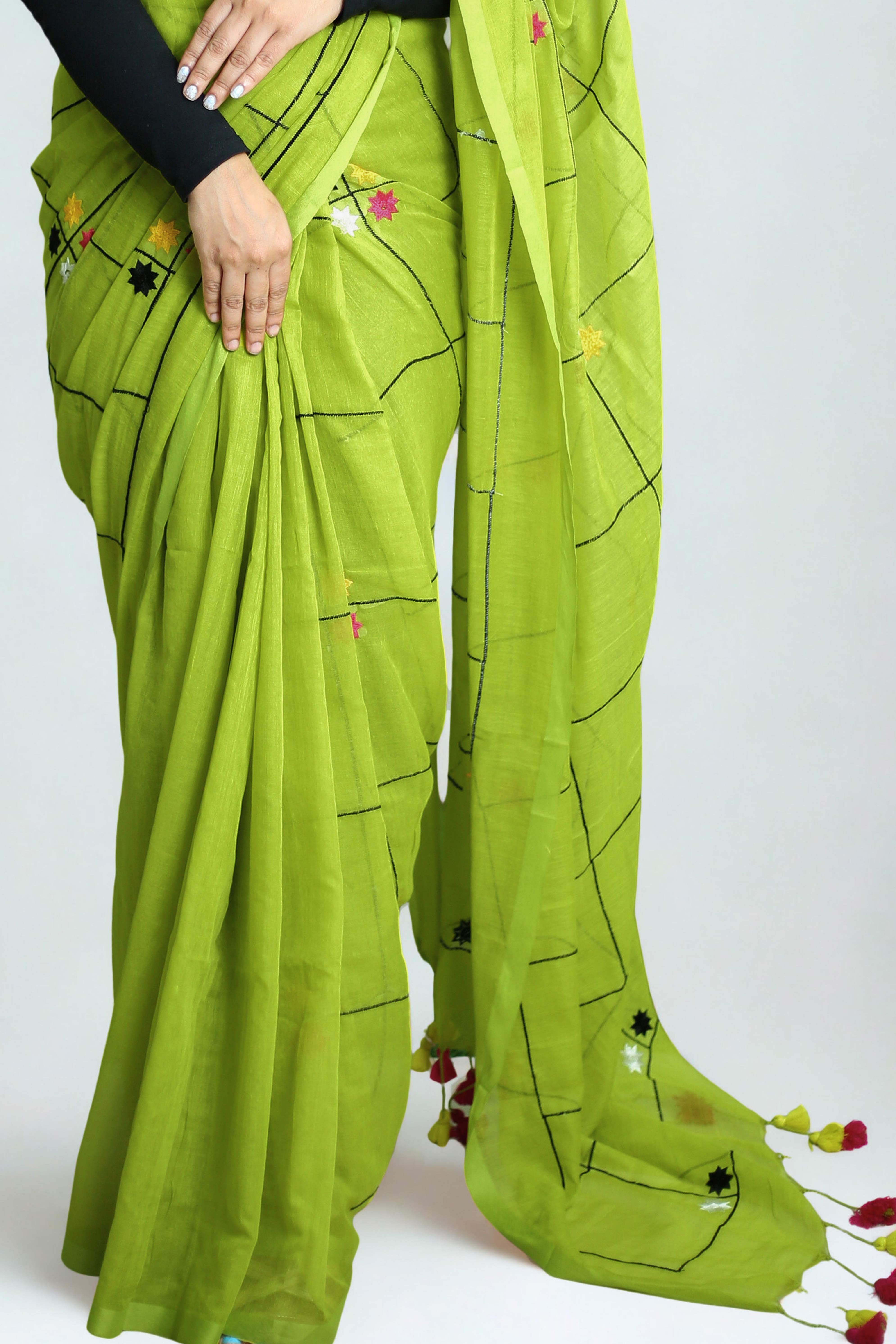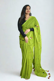 Soft and lightweight malcotton saree featuring elegant floral thread work with tassel detailing—perfect for daily wear, casual outings, and festive looks.