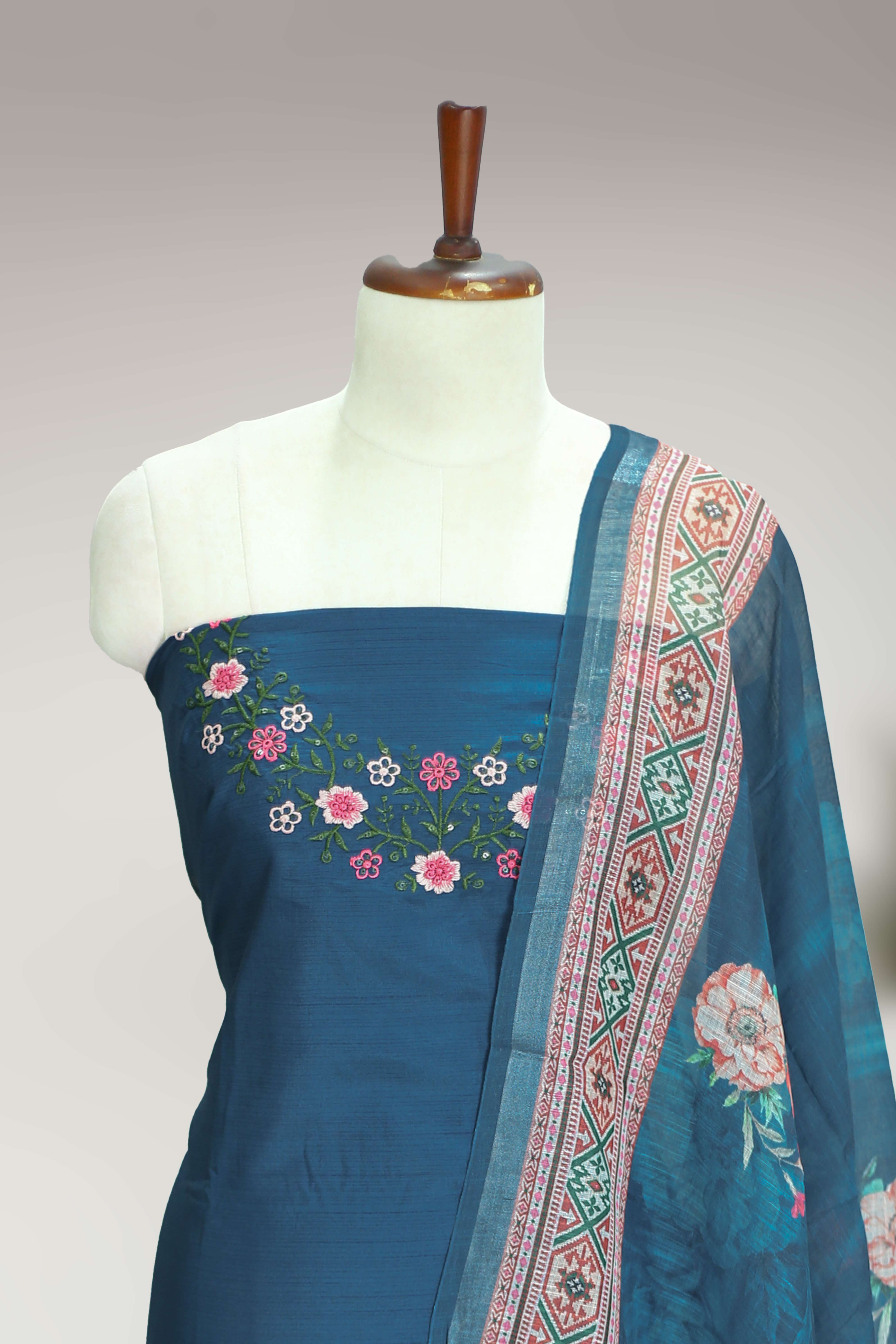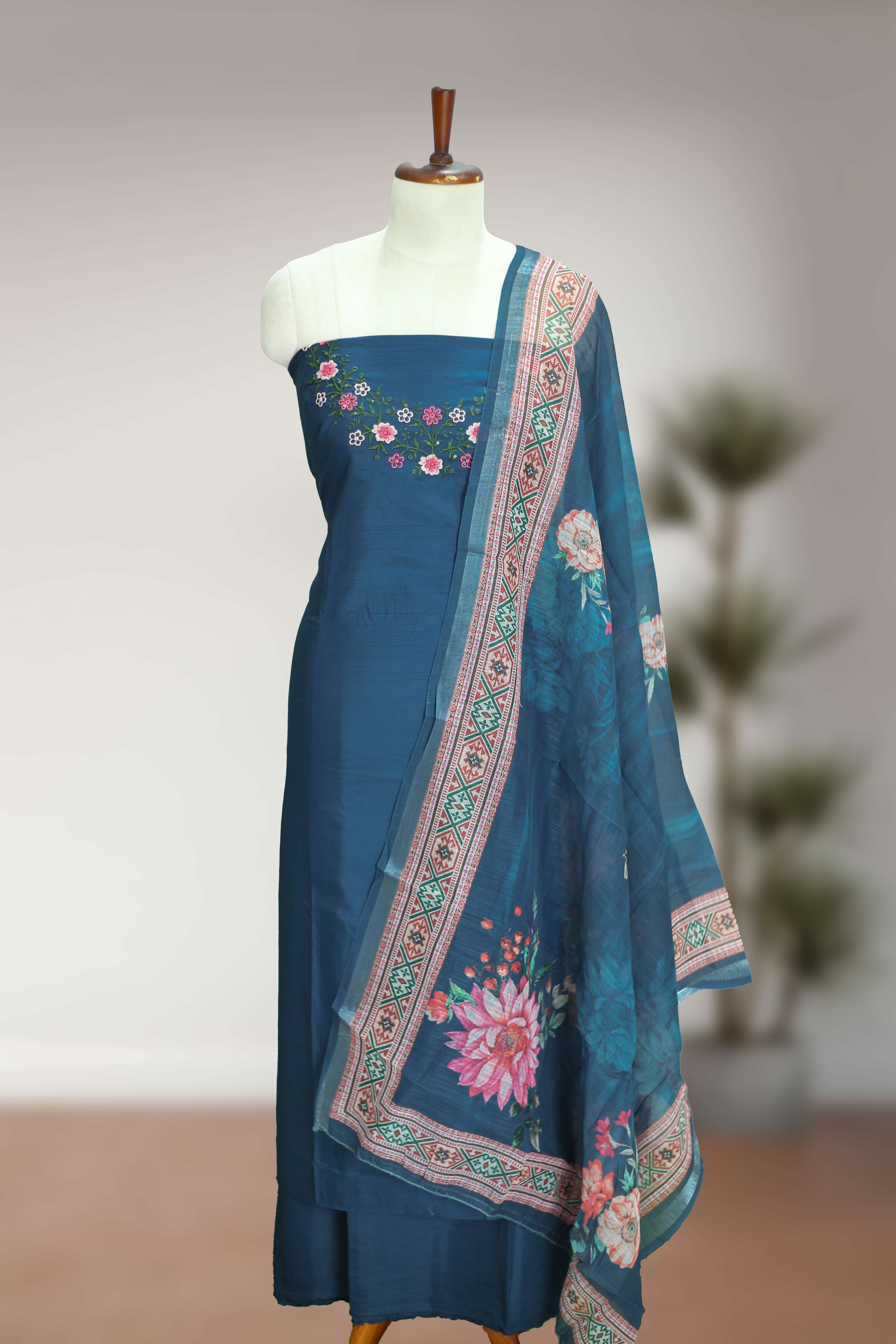 Silk Churidar Material – Floral Thread Work