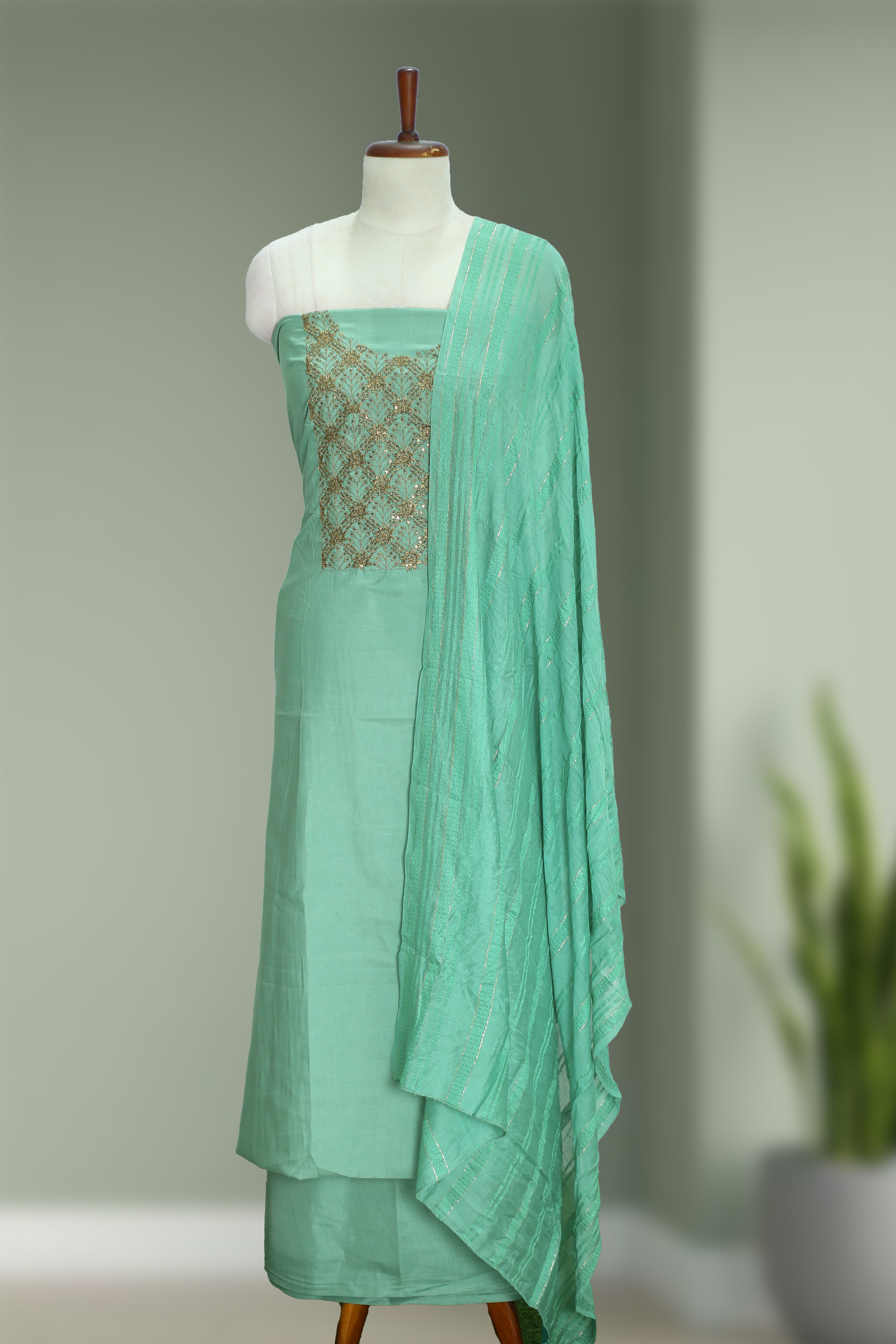 Beautiful silk churidar material featuring elegant golden thread work with sequins — perfect for festive wear, functions & traditional occasions.
