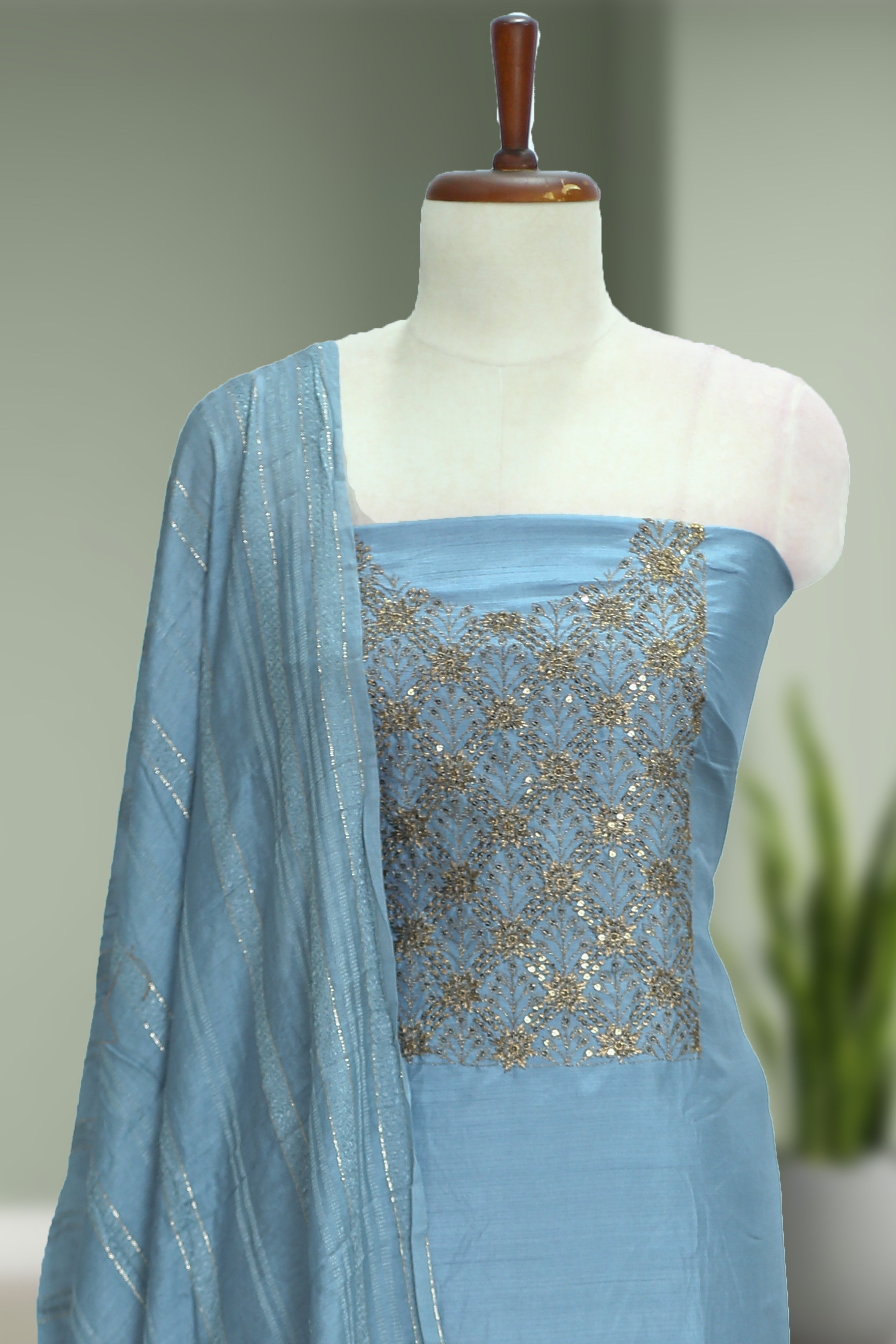 Beautiful silk churidar material featuring elegant golden thread work with sequins — perfect for festive wear, functions & traditional occasions.