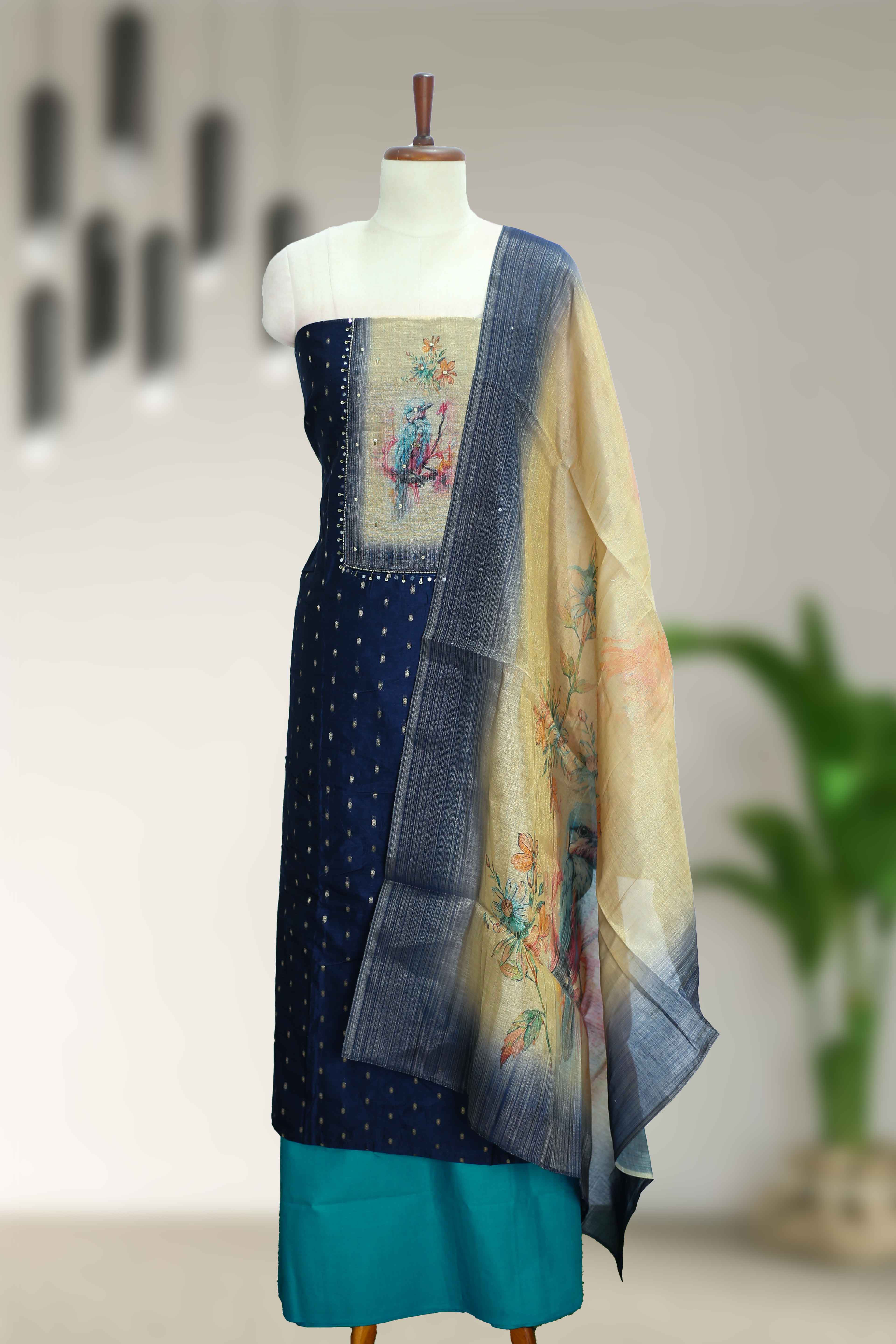 Elegant silk churidar material featuring beautifully crafted sequins and beadwork, perfect for festive wear, special occasions, and traditional styling.