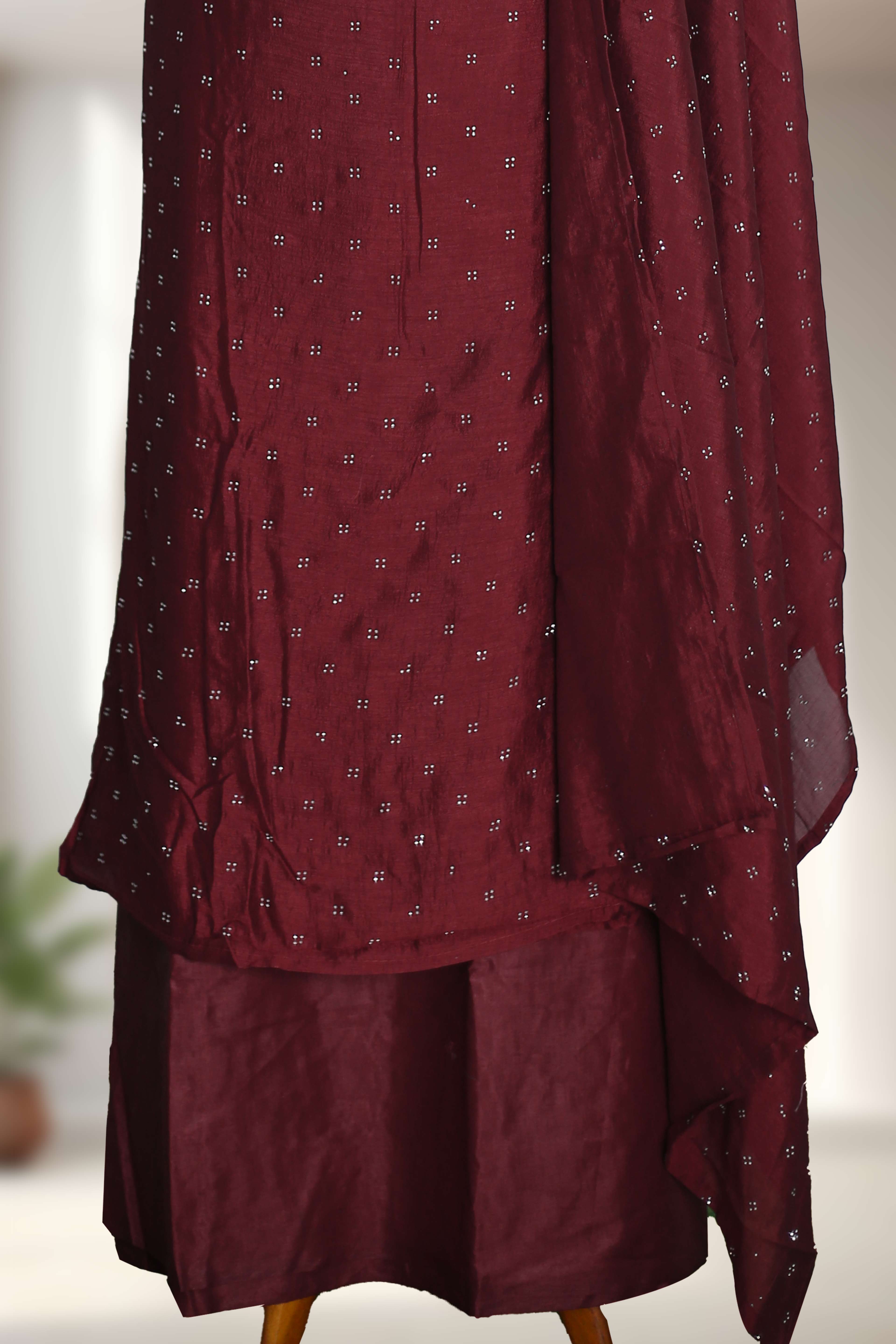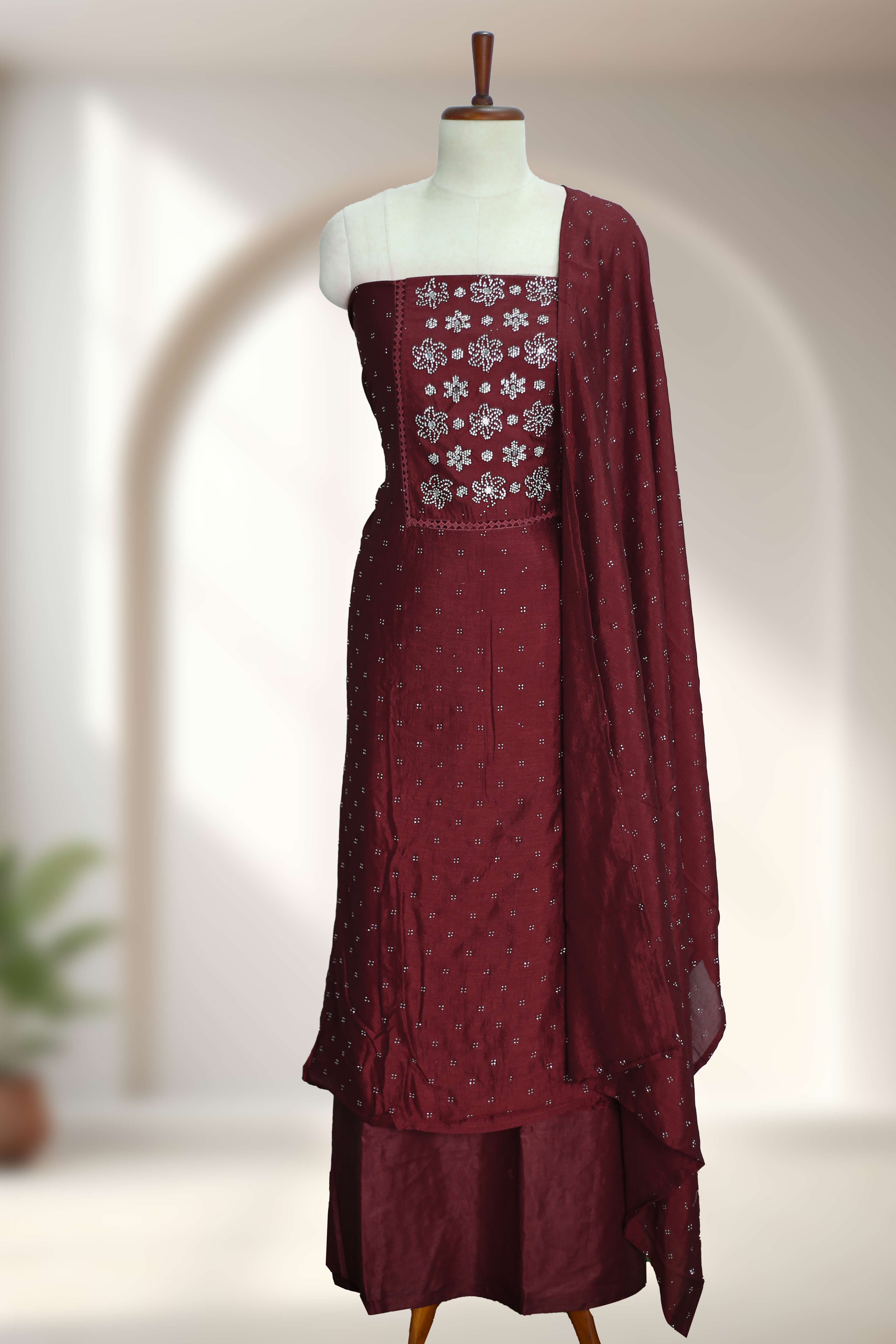 Rich silk fabric with elegant stone and mirror embellishments