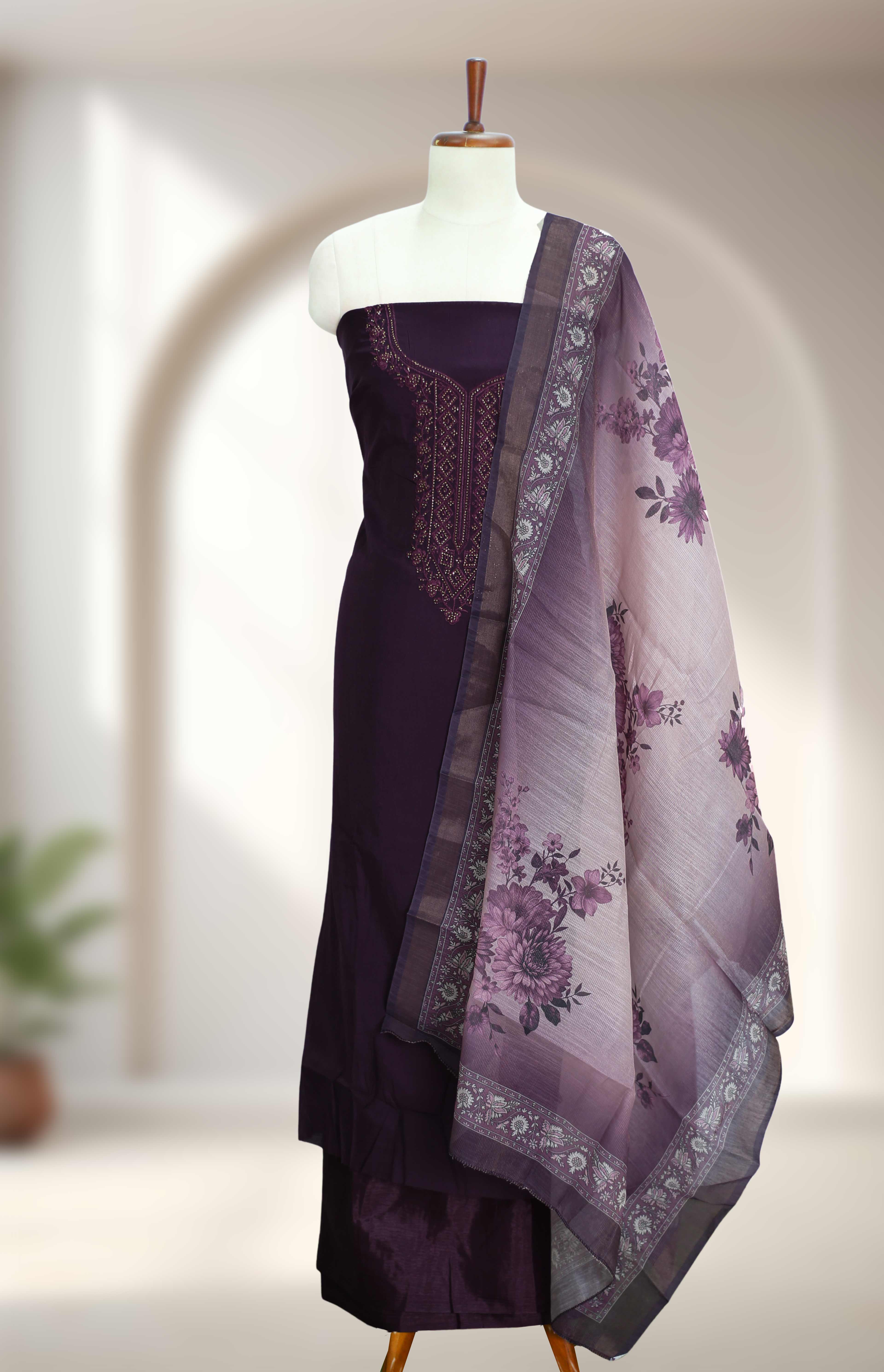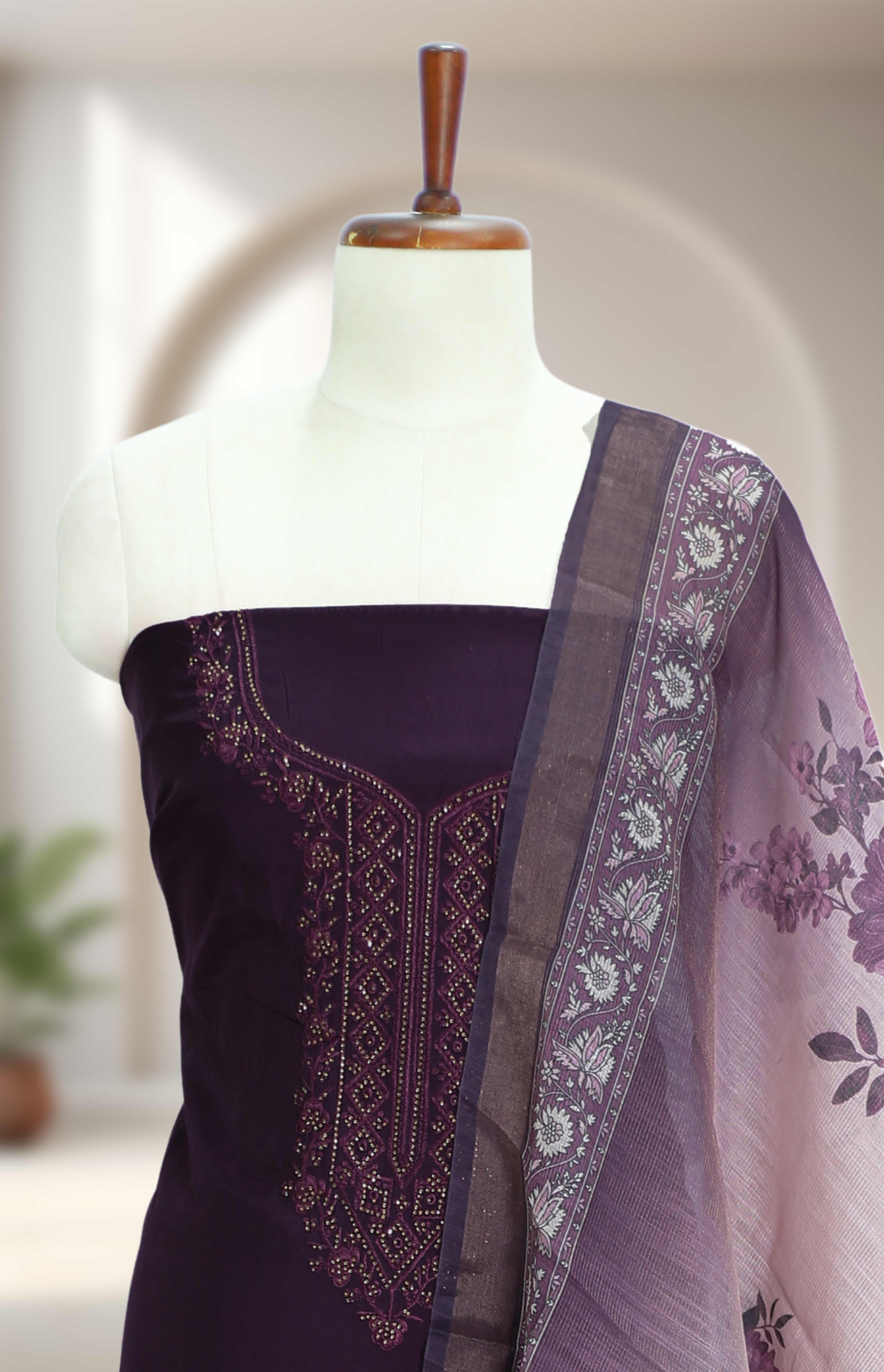 A beautifully crafted silk churidar material featuring intricate embroidery and subtle stone highlights, perfect for festive occasions and special gatherings.