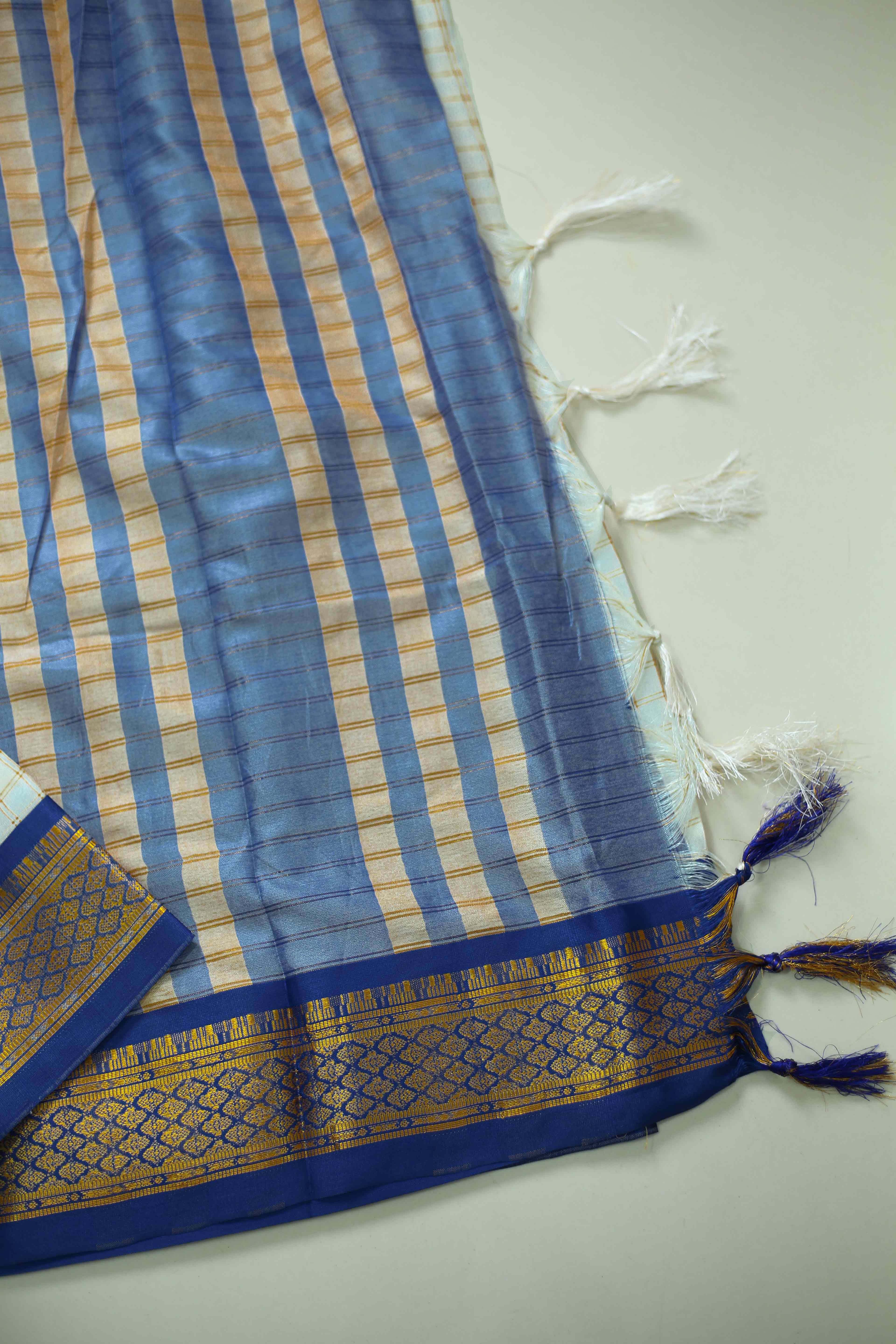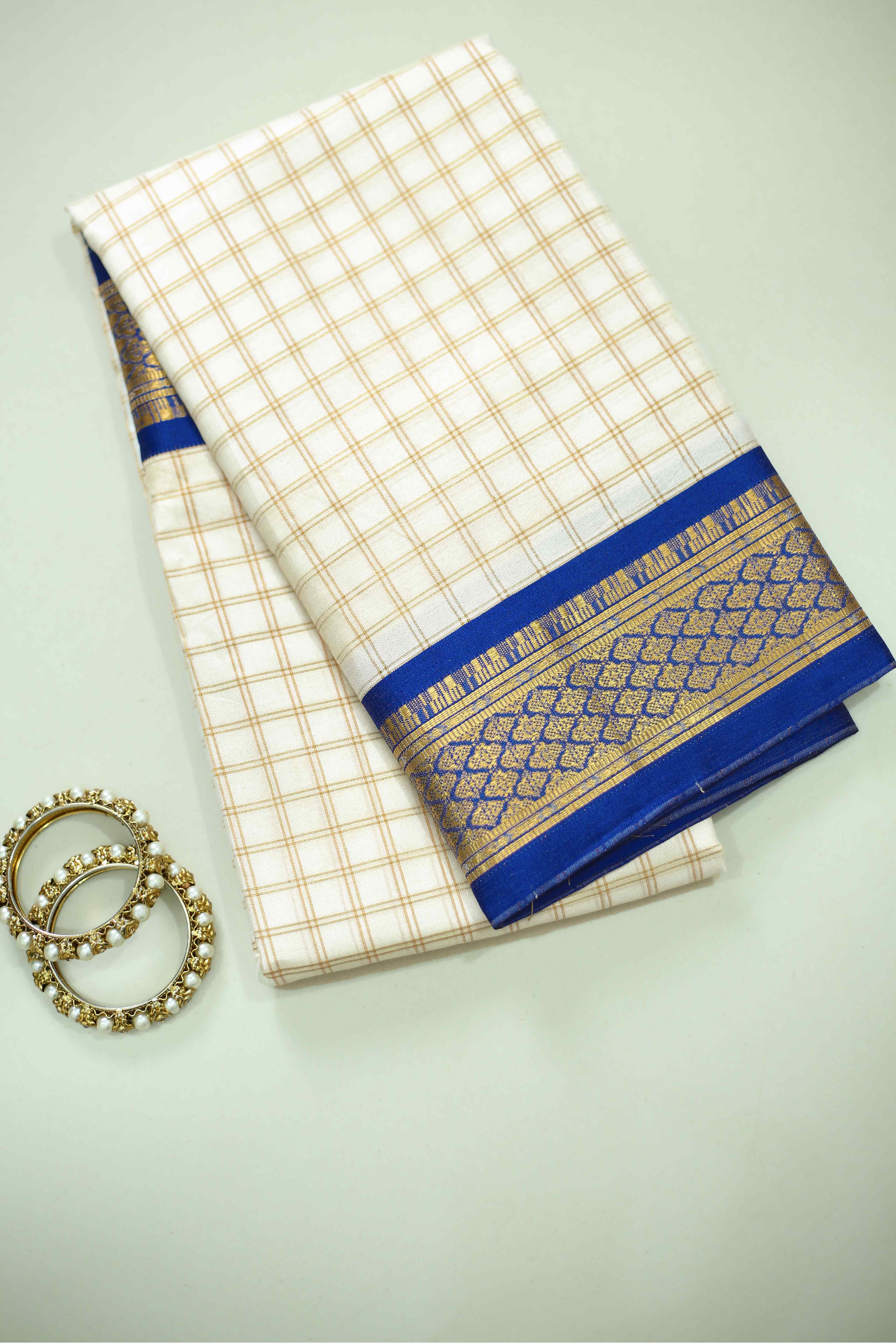 A graceful semi-silk saree featuring elegant check patterns and a beautifully detailed border.